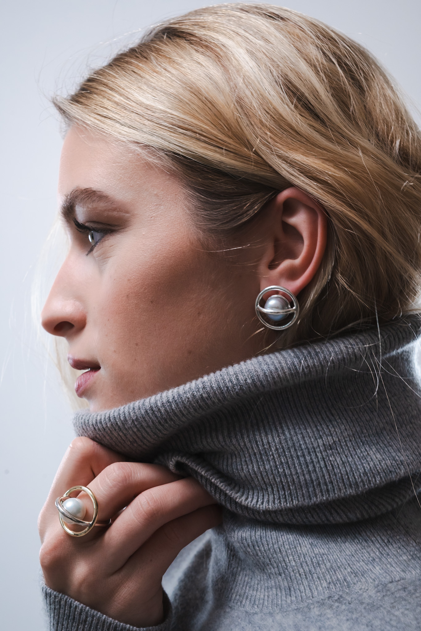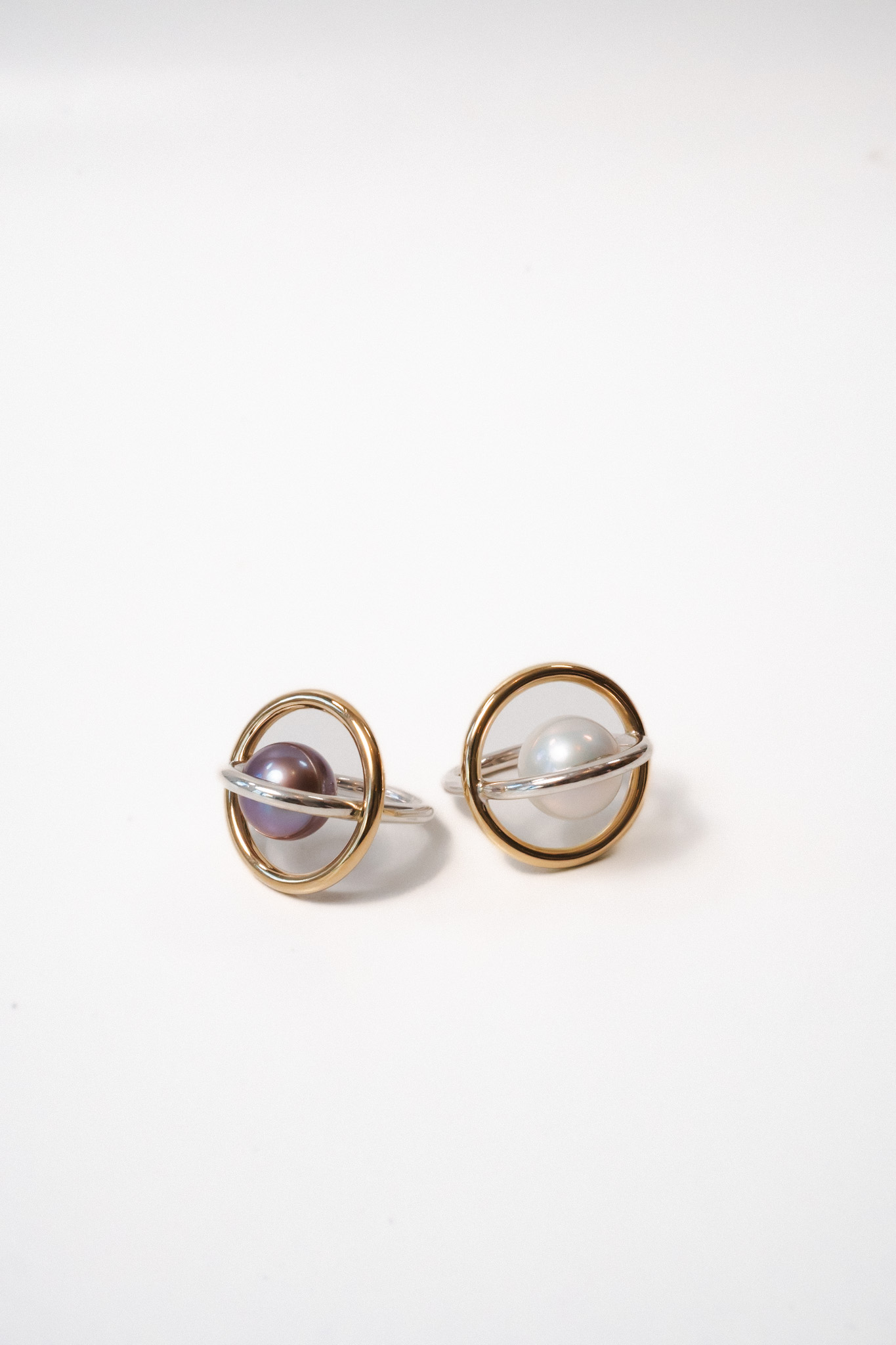 Pink Edison pearl beautifully enclosed by its 18kt yellow circular and sterling silver bands.